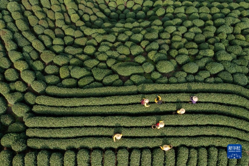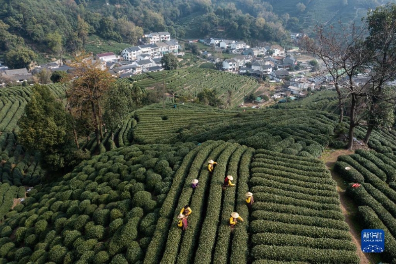 3月13日,龍井村的茶農(nóng)在采摘西湖龍井“明前茶”(無(wú)人機(jī)照片)。