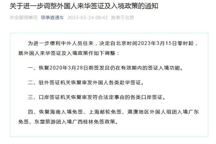 中新網(wǎng)3月14日電 據(jù)外交部領(lǐng)事司官方微信消息,為進(jìn)一步便利中外人員往來(lái),決定自北京時(shí)間2023年3月15日零時(shí)起,就外國(guó)人來(lái)華簽證及入境政策作如下調(diào)整:
