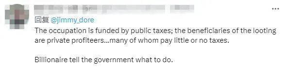 有網(wǎng)友一針見血地指出,“(美國(guó))占領(lǐng)行動(dòng)的資金來(lái)自公共稅收;劫掠的受益者是私人奸商。他們中的許多人繳稅很少或根本不交稅。億萬(wàn)富翁告訴政府該做什么?!?/p>