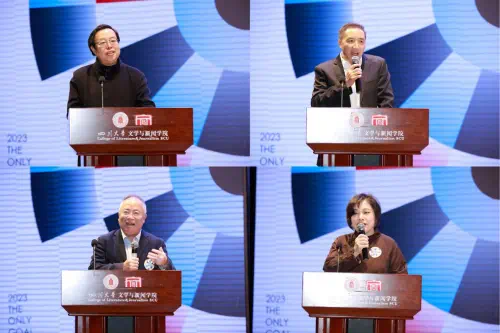左上:四川大學(xué)文學(xué)與新聞學(xué)院院長(zhǎng) 李怡 右上:四川省臺(tái)辦書(shū)記 孫樹(shù)學(xué)