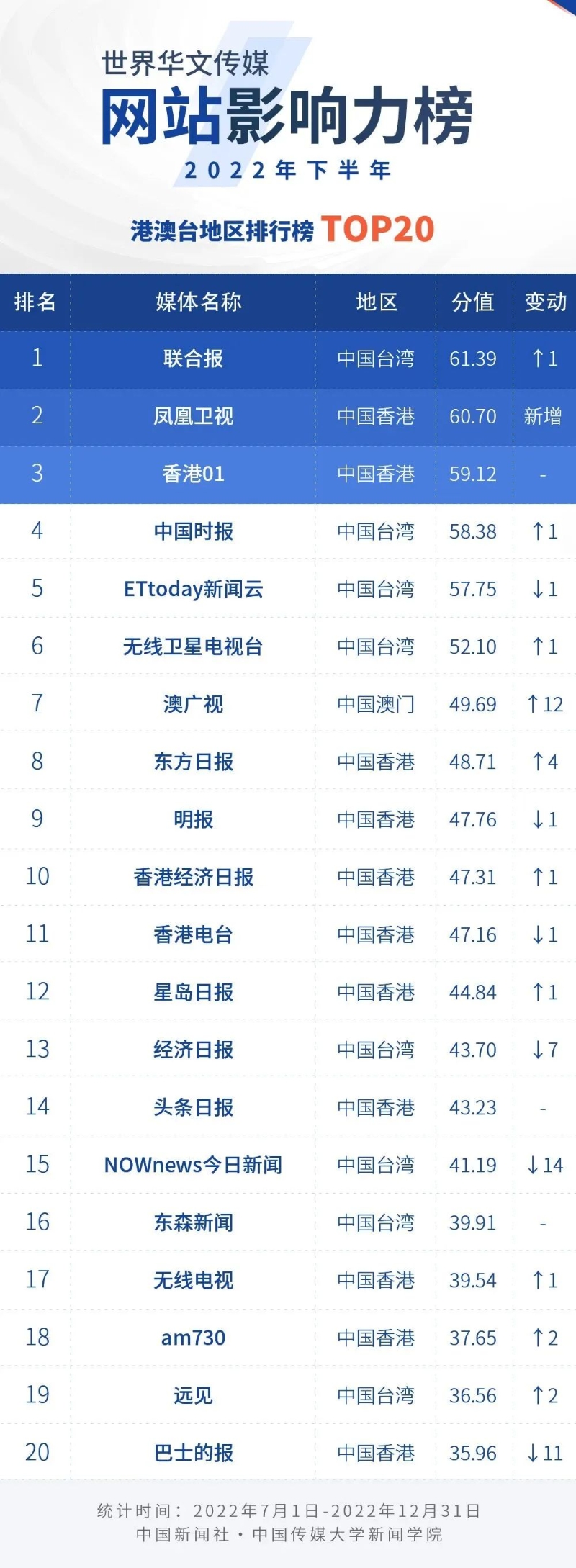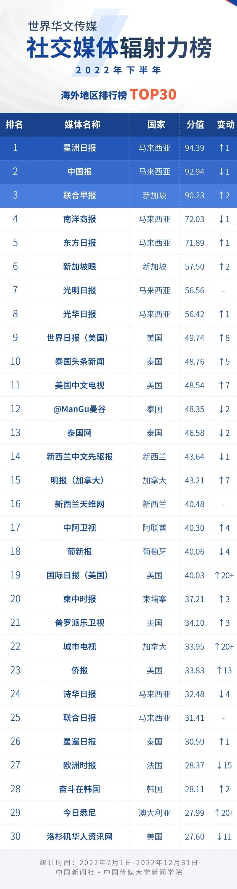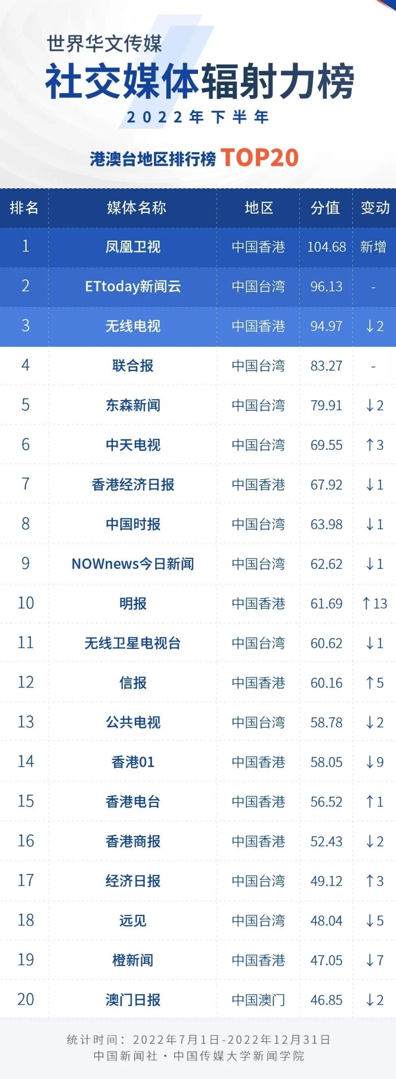 中國新聞社與中國傳媒大學(xué)新聞學(xué)院持續(xù)開展“世界華文傳媒新媒體影響力”測評項目,現(xiàn)根據(jù)2022年下半年世界華文傳媒新媒體的業(yè)務(wù)數(shù)據(jù),發(fā)布2022年下半年榜。