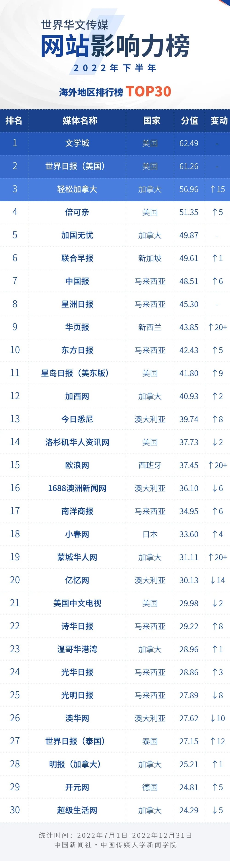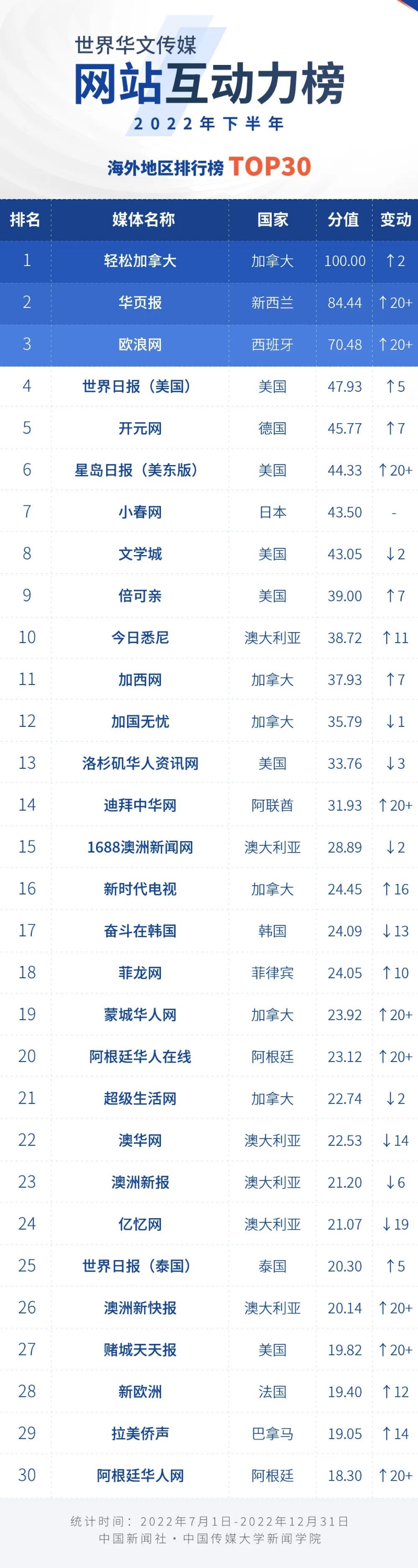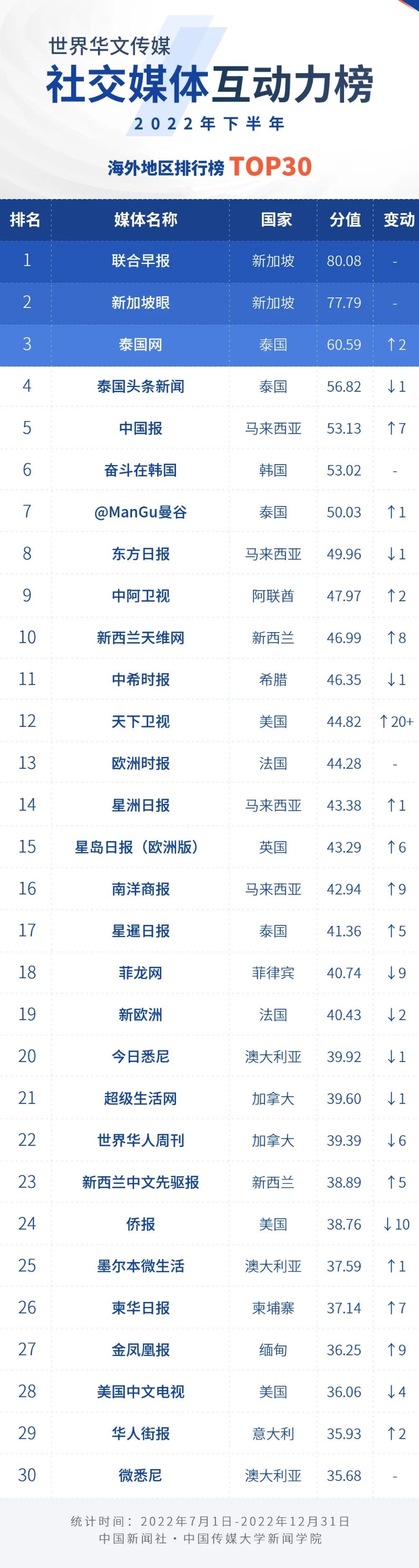 中國新聞社與中國傳媒大學(xué)新聞學(xué)院持續(xù)開展“世界華文傳媒新媒體影響力”測評項目,現(xiàn)根據(jù)2022年下半年世界華文傳媒新媒體的業(yè)務(wù)數(shù)據(jù),發(fā)布2022年下半年榜。