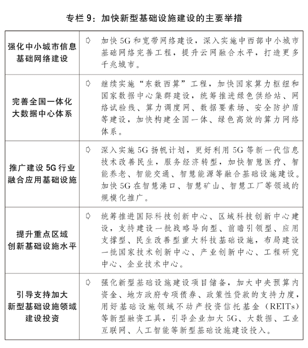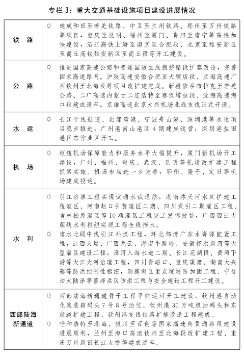 三是持續(xù)推進(jìn)重大基礎(chǔ)設(shè)施建設(shè)。優(yōu)化基礎(chǔ)設(shè)施布局、結(jié)構(gòu)、功能和系統(tǒng)集成,構(gòu)建現(xiàn)代化基礎(chǔ)設(shè)施體系。推動川藏鐵路、沿江沿海高鐵、國家水網(wǎng)等重大項目建設(shè),加快重大引調(diào)水、防洪減災(zāi)、西部陸海新通道、小洋山北側(cè)集裝箱碼頭開發(fā)建設(shè),推進(jìn)川藏公路G318線提質(zhì)改造,加快沿邊國道G219線、G331線待貫通路段建設(shè),推進(jìn)中西部鐵路、長江黃金水道、過江通道、重點(diǎn)城市群都市圈城際鐵路和市域(郊)鐵路建設(shè)。加快5G、人工智能、大數(shù)據(jù)、物聯(lián)網(wǎng)、工業(yè)互聯(lián)網(wǎng)等新型基礎(chǔ)設(shè)施建設(shè),推動智慧高速公路建設(shè),推進(jìn)民用空間基礎(chǔ)設(shè)施建設(shè),加快推進(jìn)海南商業(yè)航天發(fā)射場建設(shè),優(yōu)化升級數(shù)字基礎(chǔ)設(shè)施,加快建設(shè)信息網(wǎng)絡(luò)基礎(chǔ)設(shè)施,推進(jìn)云網(wǎng)融合和算網(wǎng)協(xié)同發(fā)展,有序推進(jìn)基礎(chǔ)設(shè)施智能升級。