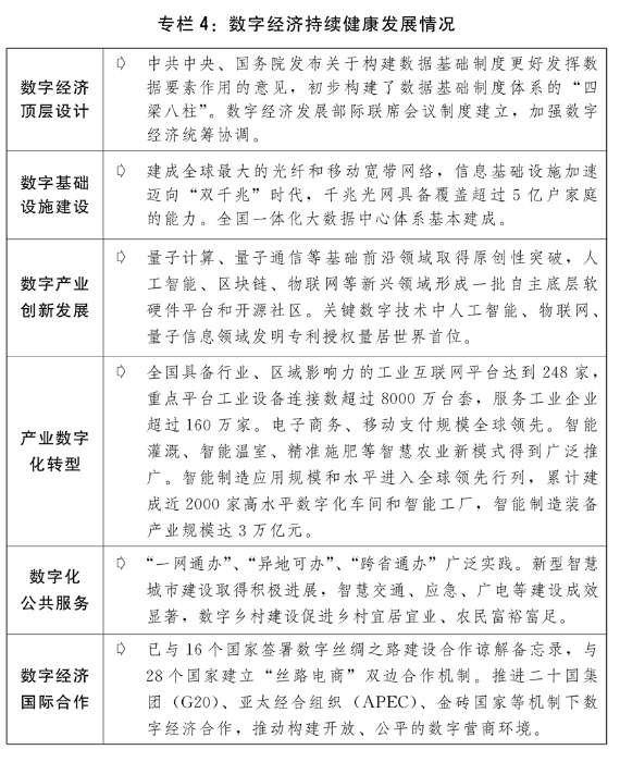 三是數(shù)字經(jīng)濟(jì)持續(xù)健康發(fā)展。制定實施構(gòu)建數(shù)據(jù)基礎(chǔ)制度更好發(fā)揮數(shù)據(jù)要素作用的政策文件,加快完善數(shù)據(jù)基礎(chǔ)制度體系,統(tǒng)籌推進(jìn)數(shù)據(jù)確權(quán)、流通交易、收益分配、安全治理。數(shù)字經(jīng)濟(jì)和實體經(jīng)濟(jì)深度融合發(fā)展,“東數(shù)西算”工程全面實施,國家算力網(wǎng)絡(luò)加快構(gòu)建,加強(qiáng)對樞紐節(jié)點(diǎn)算力基礎(chǔ)設(shè)施適度超前建設(shè)的政策支持,深入推進(jìn)傳統(tǒng)產(chǎn)業(yè)、中小企業(yè)數(shù)字化轉(zhuǎn)型,“上云用數(shù)賦智”水平不斷提升。信息通信設(shè)施加快發(fā)展,第五代移動通信(5G)建設(shè)全球領(lǐng)先,全年新建5G基站88.7萬個,累計建成231.2萬個,占全球總數(shù)的60%以上。寬帶光纖網(wǎng)絡(luò)加速布局,千兆城市已超過110個。實現(xiàn)平臺經(jīng)濟(jì)常態(tài)化監(jiān)管,平臺經(jīng)濟(jì)規(guī)范健康持續(xù)發(fā)展的基礎(chǔ)進(jìn)一步夯實。