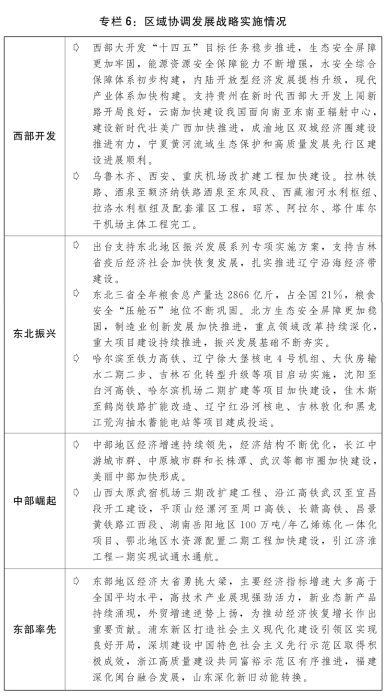 一是扎實推進(jìn)區(qū)域協(xié)調(diào)發(fā)展戰(zhàn)略。推動西部大開發(fā)形成新格局,做大做強(qiáng)特色優(yōu)勢產(chǎn)業(yè),筑牢生態(tài)安全屏障,不斷拓展國家發(fā)展的戰(zhàn)略回旋空間。推動?xùn)|北全面振興取得新突破,完善支持東北全面振興政策舉措,支持東北地區(qū)中心城市及城市群提質(zhì)增效,更好維護(hù)國家糧食、生態(tài)、能源等安全。促進(jìn)中部地區(qū)加快崛起,構(gòu)建以先進(jìn)制造業(yè)為支撐的現(xiàn)代產(chǎn)業(yè)體系,推進(jìn)高質(zhì)量發(fā)展年度重大工程項目建設(shè)。鼓勵東部地區(qū)加快推進(jìn)現(xiàn)代化,充分發(fā)揮對全產(chǎn)業(yè)鏈的穩(wěn)鏈固鏈強(qiáng)鏈作用。提高中西部和東北地區(qū)開放水平,鞏固東部沿海地區(qū)開放先導(dǎo)地位,推動安徽更好發(fā)揮連接中部地區(qū)與長三角地區(qū)的作用,推動江西等內(nèi)陸開放型經(jīng)濟(jì)試驗區(qū)建設(shè)。更好發(fā)揮國家級新區(qū)引領(lǐng)示范作用。支持欠發(fā)達(dá)地區(qū)、革命老區(qū)、民族地區(qū)、生態(tài)退化地區(qū)、資源型地區(qū)和老工業(yè)城市等加快發(fā)展。加大力度推進(jìn)興邊富民、穩(wěn)邊固邊。發(fā)展海洋經(jīng)濟(jì),高水平建設(shè)海洋創(chuàng)新示范平臺,加快建設(shè)海洋強(qiáng)國。