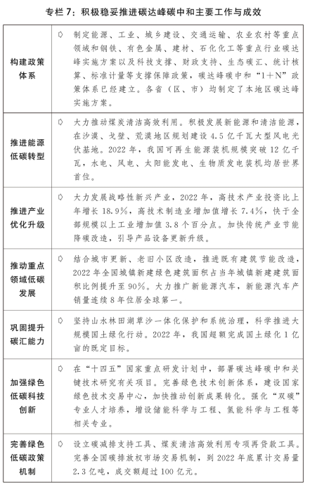 二是碳達(dá)峰碳中和積極穩(wěn)妥推進(jìn)。碳達(dá)峰碳中和“1+N”政策體系構(gòu)建完成,重點(diǎn)領(lǐng)域碳達(dá)峰實施方案和配套保障措施制定出臺,“碳達(dá)峰十大行動”扎實推進(jìn)。全國碳排放權(quán)交易市場平穩(wěn)運(yùn)行。堅持“先立后改”,加快建設(shè)先進(jìn)清潔支撐性煤電,推動煤電機(jī)組節(jié)能降碳改造、靈活性改造、供熱改造“三改聯(lián)動”,積極發(fā)展新能源和清潔能源,第一批以沙漠、戈壁、荒漠地區(qū)為重點(diǎn)的大型風(fēng)電光伏基地加快建設(shè),我國可再生能源總裝機(jī)突破12億千瓦。重點(diǎn)行業(yè)節(jié)能降碳大力推進(jìn),提高新建建筑節(jié)能水平,積極發(fā)展綠色建筑,大力推廣新能源汽車,持續(xù)推動充電基礎(chǔ)設(shè)施建設(shè),加快推進(jìn)大宗貨物和中長距離貨物運(yùn)輸“公轉(zhuǎn)鐵”、“公轉(zhuǎn)水”。單位國內(nèi)生產(chǎn)總值二氧化碳排放下降0.8%。積極參與聯(lián)合國氣候變化沙姆沙伊赫大會各項談判磋商,推動大會取得積極成果。