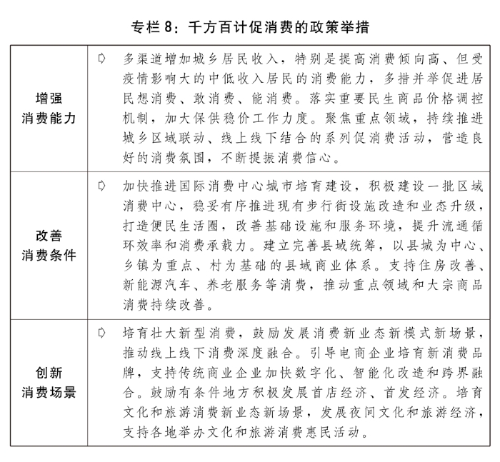 一是綜合施策釋放消費(fèi)潛力。把恢復(fù)和擴(kuò)大消費(fèi)擺在優(yōu)先位置,增強(qiáng)消費(fèi)能力,改善消費(fèi)條件,創(chuàng)新消費(fèi)場景。順應(yīng)居民消費(fèi)升級趨勢,打造內(nèi)容豐富、品質(zhì)精良、結(jié)構(gòu)合理的高質(zhì)量消費(fèi)供給體系,持續(xù)提升傳統(tǒng)消費(fèi),加快培育新型消費(fèi),不斷壯大消費(fèi)熱點(diǎn)。穩(wěn)定汽車等大宗消費(fèi),強(qiáng)化停車設(shè)施建設(shè)改造,優(yōu)化停車設(shè)施供給結(jié)構(gòu),加快推進(jìn)公路沿線、交通樞紐場站、居住區(qū)等充電設(shè)施設(shè)備建設(shè),推動公共領(lǐng)域車輛全面電動化。鼓勵有條件的地方對購買綠色智能家電、綠色建材等予以支持,持續(xù)開展家電生產(chǎn)企業(yè)回收目標(biāo)責(zé)任制行動。采取有效措施推動生活服務(wù)消費(fèi)恢復(fù),規(guī)范旅游市場秩序,大力發(fā)展城市微旅游、鄉(xiāng)村旅游和短途周邊游。落實帶薪休假制度。推進(jìn)即時零售、直播電商、云展會等新模式健康發(fā)展,拓展沉浸式交互式購物體驗。支持剛性和改善性住房、新能源汽車、養(yǎng)老服務(wù)、教育醫(yī)療文化體育服務(wù)等消費(fèi)。引導(dǎo)培育信息消費(fèi)。開展智慧商圈、智慧商店、智慧景區(qū)、旅游城市和綠色商場示范創(chuàng)建,擴(kuò)大綠色產(chǎn)品供給和消費(fèi)。促進(jìn)老字號創(chuàng)新發(fā)展。高水平辦好2023年中國品牌日系列活動,不斷提升中國品牌知名度和影響力,推動國潮品牌消費(fèi)繁榮發(fā)展。營造安心放心的消費(fèi)環(huán)境,加大消費(fèi)品質(zhì)量安全監(jiān)管力度,強(qiáng)化消費(fèi)者權(quán)益保護(hù)。