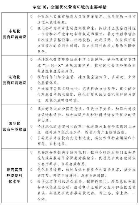 三是營造市場化法治化國際化一流營商環(huán)境。深化簡政放權(quán)、放管結(jié)合、優(yōu)化服務(wù)改革。堅持依法行政,嚴(yán)格規(guī)范公正文明執(zhí)法,帶頭遵守契約,提高政府公信力和執(zhí)行力。強(qiáng)化公平競爭審查制度剛性約束,持續(xù)清理修改不符合優(yōu)化營商環(huán)境條例的規(guī)章和規(guī)范性文件,推動各地結(jié)合實際出臺配套政策措施,促進(jìn)全國范圍營商環(huán)境持續(xù)改善。深化營商環(huán)境創(chuàng)新試點(diǎn),支持有條件的地方率先加大營商環(huán)境改革力度。不斷優(yōu)化中國營商環(huán)境評價體系,健全中國營商環(huán)境評價長效機(jī)制。制定進(jìn)一步提升重點(diǎn)區(qū)域、工業(yè)園區(qū)等營商環(huán)境水平的行動方案,推動城市群、都市圈等重點(diǎn)區(qū)域營商環(huán)境一體化發(fā)展。推動建立涉企收費(fèi)長效監(jiān)管機(jī)制。充分發(fā)揮全國一體化政務(wù)服務(wù)平臺“一網(wǎng)通辦”樞紐作用,深入推進(jìn)“一件事一次辦”改革舉措,加快電子證照應(yīng)用,持續(xù)提升政務(wù)服務(wù)“跨省通辦”質(zhì)效。建立企業(yè)信用狀況綜合評價體系,強(qiáng)化企業(yè)信用風(fēng)險分類管理,完善社會信用統(tǒng)一代碼制度,加強(qiáng)信用信息共享應(yīng)用,促進(jìn)中小微企業(yè)融資便利。