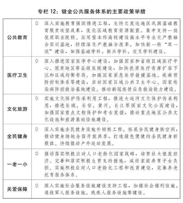 六是健全公共服務(wù)體系。出臺新版國家基本公共服務(wù)標(biāo)準(zhǔn),開展基本公共服務(wù)均等化監(jiān)測評估。持續(xù)推動生活性服務(wù)業(yè)補(bǔ)短板上水平,研究出臺推進(jìn)高品質(zhì)生活城市建設(shè)的政策措施。加強(qiáng)農(nóng)村公共服務(wù)體系建設(shè),健全常住地提供基本公共服務(wù)制度。深入實施積極應(yīng)對人口老齡化國家戰(zhàn)略,發(fā)展養(yǎng)老事業(yè)和養(yǎng)老產(chǎn)業(yè),擴(kuò)大普惠養(yǎng)老供給,構(gòu)建居家社區(qū)機(jī)構(gòu)相協(xié)調(diào)、醫(yī)養(yǎng)康養(yǎng)相結(jié)合的養(yǎng)老服務(wù)體系,加強(qiáng)老年健康服務(wù)和管理,研究支持銀發(fā)經(jīng)濟(jì)發(fā)展的政策體系。推動落實積極生育支持措施,發(fā)展普惠托育服務(wù)體系,降低生育、養(yǎng)育、教育成本,促進(jìn)人口長期均衡發(fā)展。持續(xù)完善“一老一小”服務(wù)體系,擴(kuò)大養(yǎng)老托育服務(wù)供給。有序推進(jìn)第二批國家兒童友好城市建設(shè)。大力發(fā)展社會主義先進(jìn)文化,實施文化保護(hù)傳承利用工程,加大文物和文化遺產(chǎn)保護(hù)力度,健全現(xiàn)代公共文化服務(wù)體系,推進(jìn)實施國家文化數(shù)字化,創(chuàng)新實施文化惠民工程,建好用好國家文化公園,推動智慧廣電、智慧旅游建設(shè),促進(jìn)文化和旅游深度融合發(fā)展。繁榮發(fā)展哲學(xué)社會科學(xué)。實施全民健身設(shè)施補(bǔ)短板工程,推動構(gòu)建更高水平的全民健身公共服務(wù)體系。推動家政進(jìn)社區(qū),提升基層家政服務(wù)網(wǎng)點(diǎn)服務(wù)能力。推動優(yōu)撫醫(yī)院、光榮院改革提質(zhì),加強(qiáng)烈士紀(jì)念設(shè)施提質(zhì)改造,繼續(xù)加強(qiáng)精神衛(wèi)生福利設(shè)施、省級盲人按摩醫(yī)院等建設(shè)。加強(qiáng)公共法律服務(wù)體系建設(shè)。