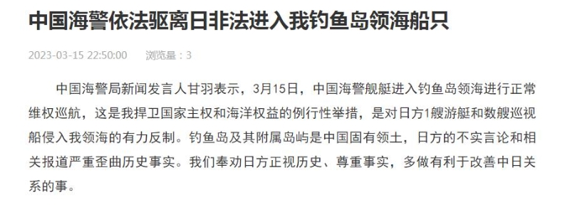 中新網(wǎng)3月15日電 據(jù)中國海警局網(wǎng)站消息,中國海警局新聞發(fā)言人甘羽表示,3月15日,中國海警艦艇進入釣魚島領(lǐng)海進行正常維權(quán)巡航,這是我捍衛(wèi)國家主權(quán)和海洋權(quán)益的例行性舉措,是對日方1艘游艇和數(shù)艘巡視船侵入我領(lǐng)海的有力反制。釣魚島及其附屬島嶼是中國固有領(lǐng)土,日方的不實言論和相關(guān)報道嚴重歪曲歷史事實。我們奉勸日方正視歷史、尊重事實,多做有利于改善中日關(guān)系的事。