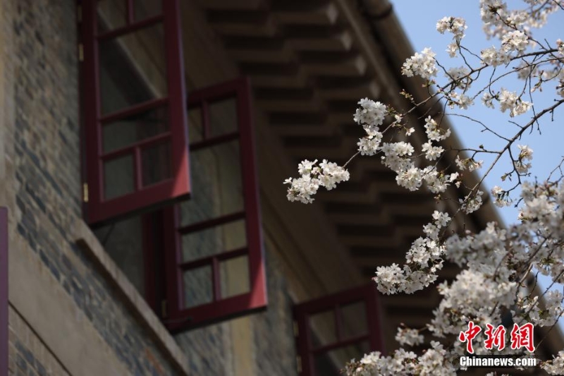 白色櫻花與青色琉璃瓦相映成畫。趙軍 攝
