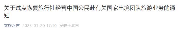 此前,據(jù)“文旅之聲”微信公眾號(hào)1月20日消息,2023年2月6日起,試點(diǎn)恢復(fù)全國(guó)旅行社及在線旅游企業(yè)經(jīng)營(yíng)中國(guó)公民赴有關(guān)國(guó)家出境團(tuán)隊(duì)旅游和“機(jī)票+酒店”業(yè)務(wù)。