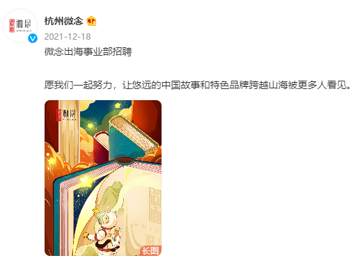 2021年12月,已在海外渠道建設上有所收獲的微念發(fā)布出海事業(yè)部招聘啟事,為其全新成立的出海事業(yè)部招納人才,全網招納擁有海外媒體傳播策劃、海外品牌營銷策劃、海外商務經理等工作經驗的人才,組建具有海外運營經驗的團隊。