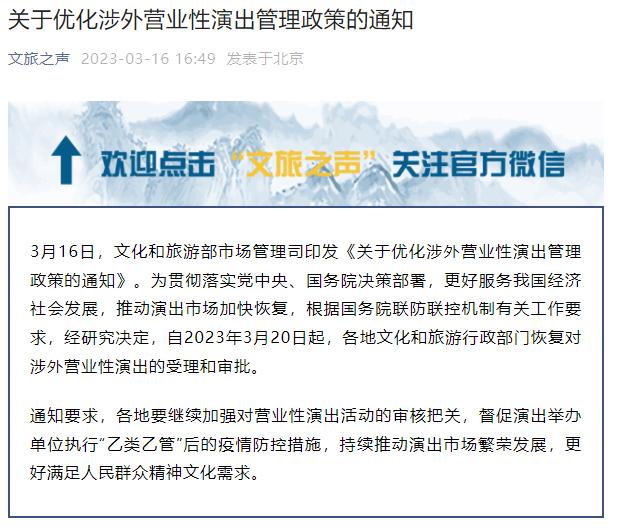 中新網(wǎng)3月16日電 據(jù)文化和旅游部官方微信消息,16日,文化和旅游部市場(chǎng)管理司印發(fā)《關(guān)于優(yōu)化涉外營(yíng)業(yè)性演出管理政策的通知》。自2023年3月20日起,各地文化和旅游行政部門恢復(fù)對(duì)涉外營(yíng)業(yè)性演出的受理和審批。