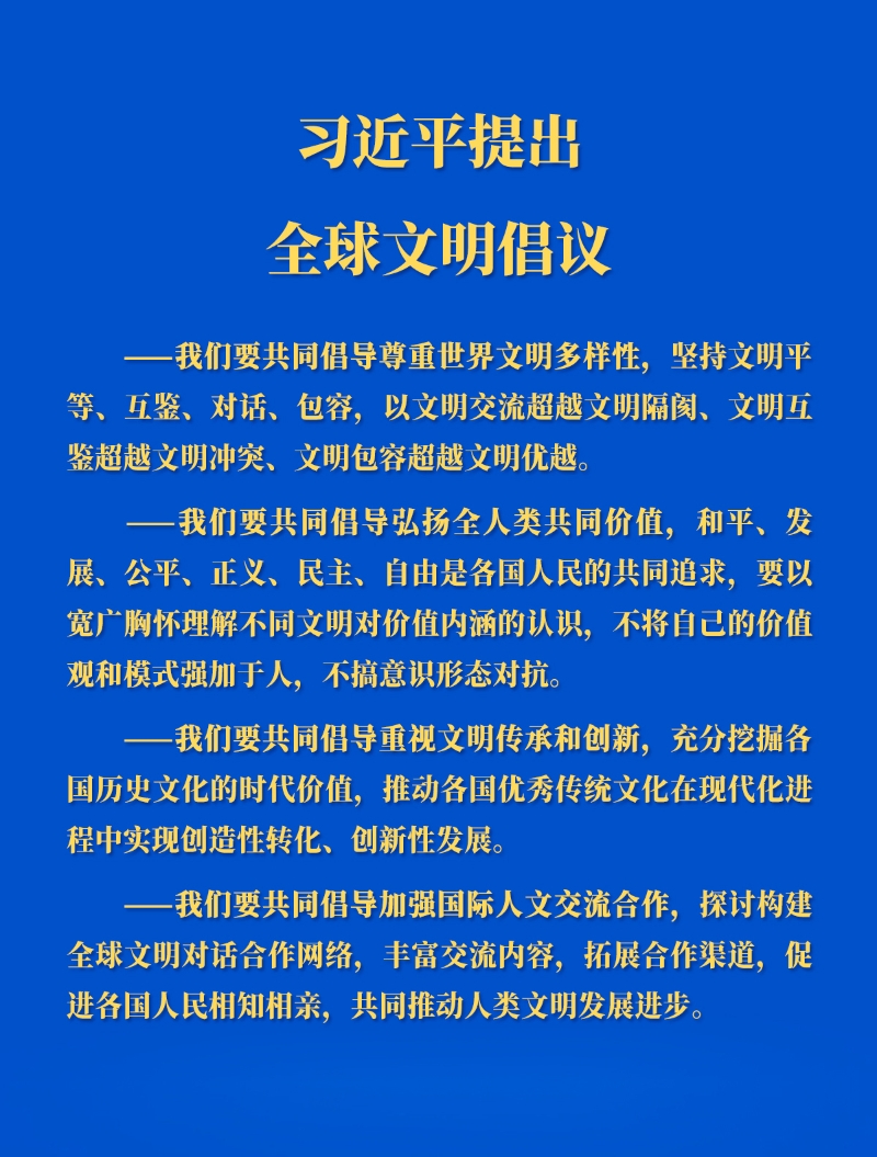 習(xí)近平總書(shū)記用四個(gè)“共同倡導(dǎo)”對(duì)全球文明倡議的主要內(nèi)容進(jìn)行概括,為推動(dòng)文明交流互鑒、促進(jìn)人類文明進(jìn)步提供中國(guó)方案。
