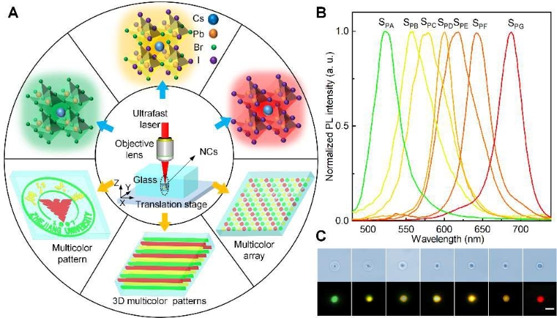 當(dāng)將飛秒激光聚焦到材料內(nèi)部時(shí),會(huì)產(chǎn)生各種高度非線性效應(yīng),這種極端條件下光與物質(zhì)相互作用充滿未知和挑戰(zhàn)。浙江大學(xué)邱建榮團(tuán)隊(duì)及其合作者們發(fā)現(xiàn)了飛秒激光誘導(dǎo)復(fù)雜體系微納結(jié)構(gòu)形成的新機(jī)制。以含氯溴碘離子的氧化物玻璃體系為例,實(shí)現(xiàn)了玻璃中具有成分和帶隙可控發(fā)光可調(diào)的鈣鈦礦納米晶3D直接光刻,呈現(xiàn)紅橙黃綠藍(lán)等不同顏色的發(fā)光。形成的納米晶在紫外線輻照、有機(jī)溶液浸泡和250℃高溫環(huán)境中表現(xiàn)出顯著的穩(wěn)定性。并進(jìn)一步演示了這種3D微納結(jié)構(gòu)在超大容量長壽命信息存儲(chǔ)、高穩(wěn)定的最小像素尺寸微米級(jí)的Micro-LED列陣,實(shí)現(xiàn)了1080p級(jí)別動(dòng)態(tài)立體彩色全息顯示。該成果揭示了飛秒激光誘導(dǎo)空間選擇性介觀尺度分相和離子交換的規(guī)律,開拓了飛秒激光三維極端制造新技術(shù)原理。