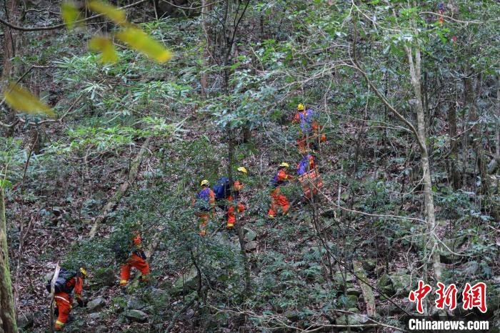 消防員在密林中尋找傷員。 李袁輝 攝
