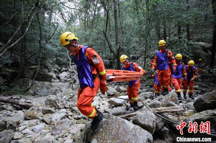 消防員將傷員從山坡往山下轉(zhuǎn)運?!±钤x 攝