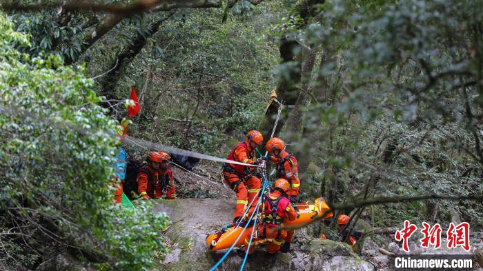 消防員利用繩索將傷員下降至崖底?!±钤x 攝