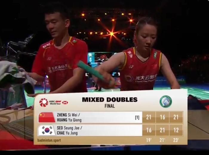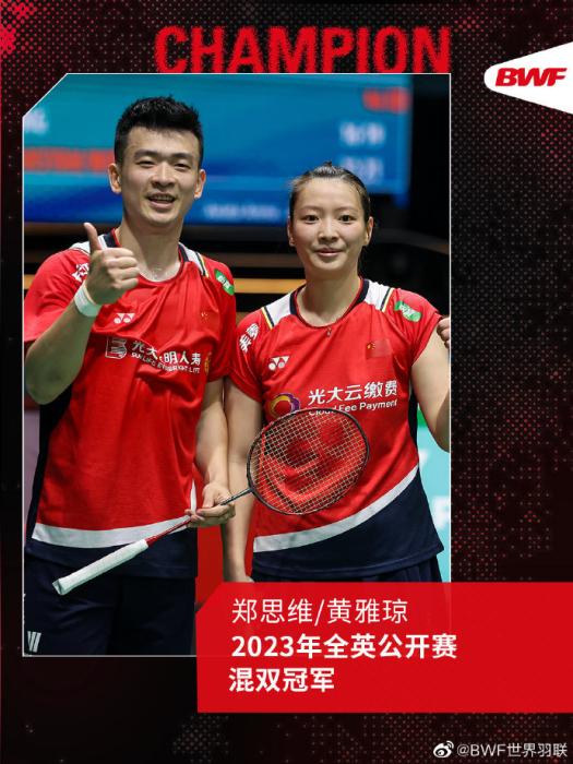 混雙決賽被安排在第二場進行,“雅思”代表國羽率先登場。比賽中,作為頭號種子的鄭思維/黃雅瓊以21:16、16:21、21:12,大比分2:1擊敗韓國組合徐承宰/蔡侑汀,繼2019年后第二次奪得全英公開賽冠軍。這也是兩人繼馬來西亞1000賽后的賽季第二冠。