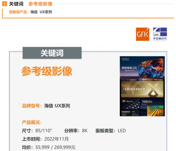 GfK中怡康點(diǎn)評道:海信一直在技術(shù)上推陳出新,2022年9月推出全新顯示技術(shù)平臺ULED X,將各項(xiàng)配置大幅拉高,并搭載自研的8K圖像處理芯片,可謂2022年現(xiàn)象級產(chǎn)品;110 UX還斬獲CES 2023創(chuàng)新獎,未來可期。