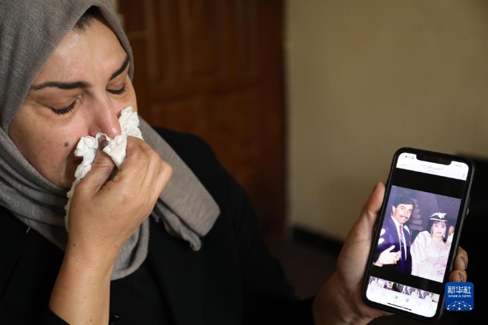 2月14日,在伊拉克北部薩拉赫丁省祖盧耶鎮(zhèn),松杜絲·拉米展示她和丈夫阿米爾的合影。新華社發(fā)(哈利勒·達伍德攝)