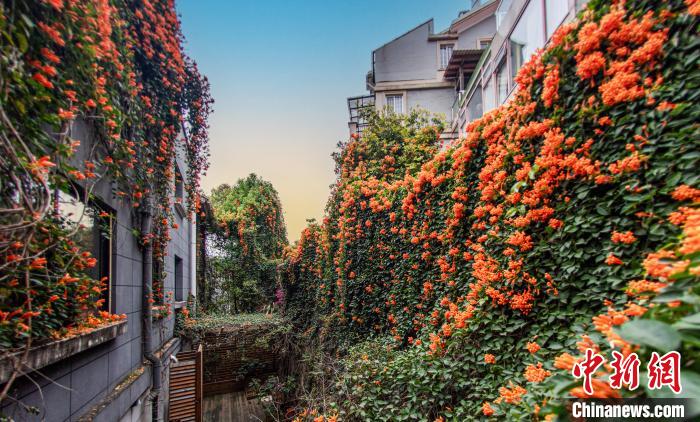3月19日,在福建省建甌市新區(qū)的一處路段,小路巷尾,橙紅鮮艷的炮仗花,爬滿廊架?!∥河狼?攝