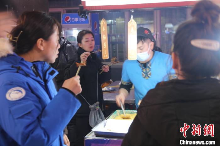 游客們圍著小攤吃烤羊腸。 潘琦 攝