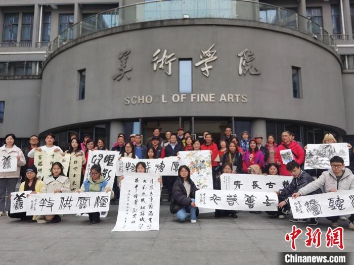 圖為臺灣書畫家交流團到訪貴州民族大學,現(xiàn)場創(chuàng)作書畫作品并合影留念。 周燕玲 攝