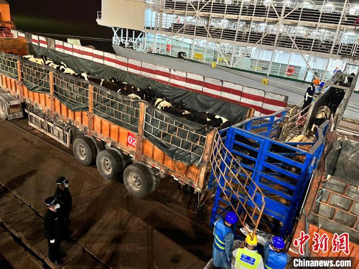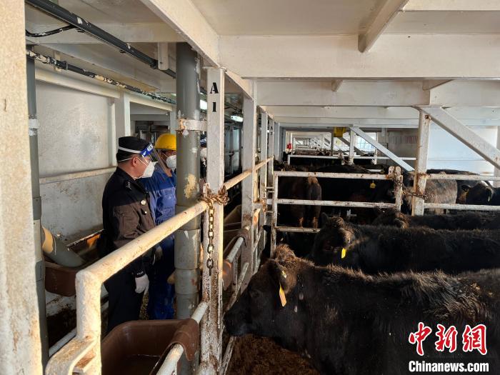 邊檢民警全程監(jiān)護活牛卸載入境。 廣西欽州保稅港區(qū)出入境邊防檢查站供圖