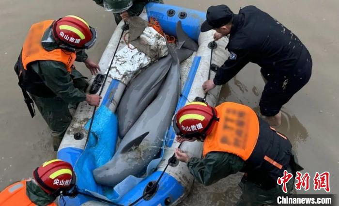 朱培洪赤腳翻下海塘,拉起橡皮艇,快速向兩頭江豚走去,眾人合力將兩頭江豚抱進橡皮艇往岸邊拉去。到達岸邊后,救援人員利用工地的吊車將橡皮艇拉上海塘。