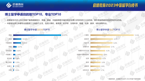 啟德留學(xué)2020-2022年客戶(hù)服務(wù)數(shù)據(jù)顯示,博士留學(xué)的申請(qǐng)量平均每年增長(zhǎng)10-15%, 2022年相比2021年增長(zhǎng)了21.8%;美國(guó)(61.97%)、英國(guó)(10.55%)、中國(guó)香港(10.06%)是中國(guó)內(nèi)地學(xué)生博士求學(xué)的三大目的地。博士留學(xué)學(xué)科分布中,理工科占比超過(guò)5成,前十大申請(qǐng)專(zhuān)業(yè)分別是計(jì)算機(jī)(12.6%)、教育學(xué)(6.5%)、經(jīng)濟(jì)學(xué)(6.4%)、生物科學(xué)(5.7%)、物理學(xué)與天文學(xué)(4.3%)、傳播學(xué)與媒體研究(3.6%)、化學(xué)(3.2%)、數(shù)學(xué)(3%)、語(yǔ)言學(xué)(2.8%)、材料科學(xué)(2.7%)。