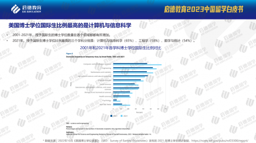 《美國(guó)博士學(xué)位調(diào)查》發(fā)布的2021年博士學(xué)生統(tǒng)計(jì)數(shù)據(jù)顯示,中國(guó)是赴美就讀博士的第一大生源國(guó),2011年至2021年,在授予學(xué)生簽證持有者的181446個(gè)博士學(xué)位中,來(lái)自中國(guó)的學(xué)生(59430)占比接近1/3 。2021年,授予國(guó)際生博士學(xué)位比例最高的三個(gè)學(xué)科分別是:計(jì)算機(jī)與信息科學(xué)(65%)、工程學(xué)(58%)、數(shù)學(xué)與統(tǒng)計(jì)(54%),并且自2001年以來(lái),國(guó)際生比例增加最大的均出現(xiàn)在計(jì)算機(jī)與信息科學(xué)、數(shù)學(xué)與統(tǒng)計(jì)領(lǐng)域。