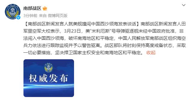 據(jù)中國人民解放軍南部戰(zhàn)區(qū)官方微博消息,南部戰(zhàn)區(qū)新聞發(fā)言人田軍里空軍大校表示,3月23日,美“米利厄斯”號(hào)導(dǎo)彈驅(qū)逐艦未經(jīng)中國政府批準(zhǔn),非法闖入中國西沙領(lǐng)海,破壞南海地區(qū)和平穩(wěn)定,中國人民解放軍南部戰(zhàn)區(qū)組織海空兵力依法進(jìn)行跟蹤監(jiān)視并予以警告驅(qū)離。戰(zhàn)區(qū)部隊(duì)將時(shí)刻保持高度戒備狀態(tài),采取一切必要措施,堅(jiān)決捍衛(wèi)國家主權(quán)安全和南海地區(qū)和平穩(wěn)定。