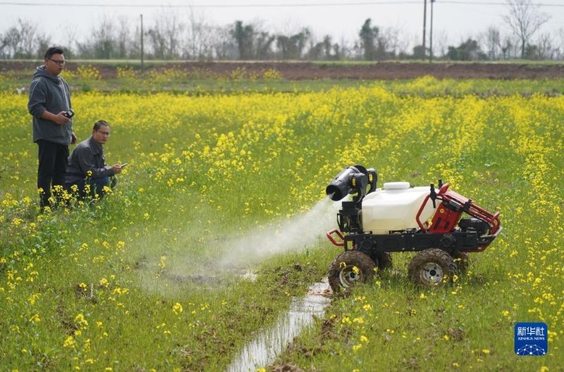 在位于江西省南昌縣蔣巷鎮(zhèn)的大田農(nóng)社,無人植保機正在對油菜進行植保作業(yè)(2021年3月12日攝)。 新華社記者 萬象 攝