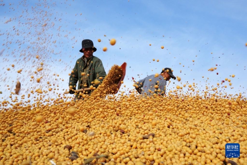 在北大荒農(nóng)墾集團有限公司北安分公司趙光農(nóng)場有限公司,工作人員在一處曬場的大豆堆上忙碌(2022年10月20日攝)。 新華社記者 王建威 攝