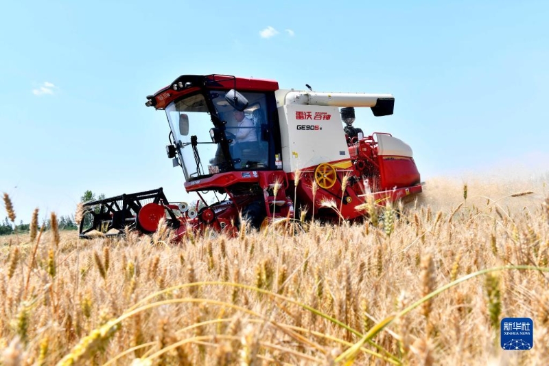 在山東省惠民縣桑落墅鎮(zhèn),農(nóng)民駕駛農(nóng)機收獲小麥(2022年6月7日攝)。 新華社記者 郭緒雷 攝