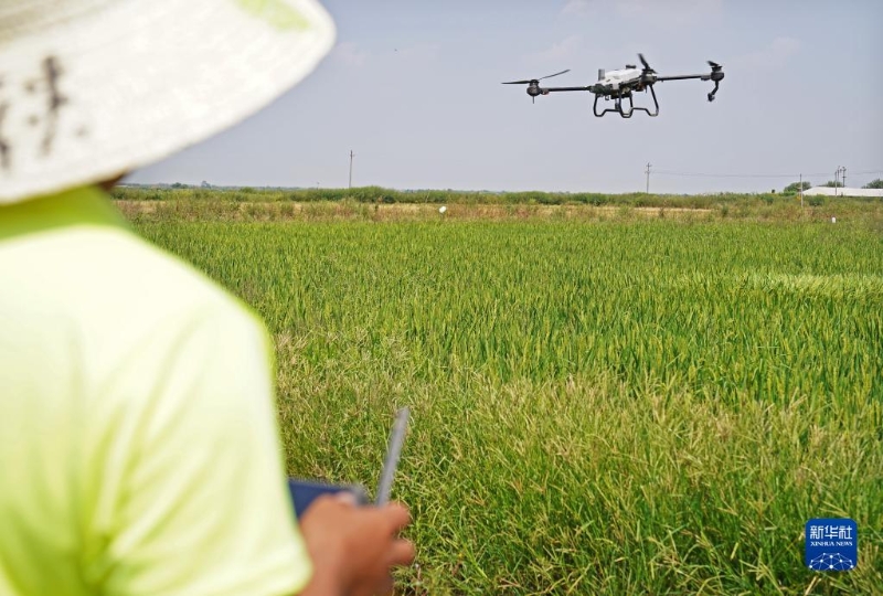 在位于江西省南昌縣蔣巷鎮(zhèn)的大田農(nóng)社,農(nóng)民正在操控無人機為稻田施肥(2022年9月16日攝)。 新華社記者 萬象 攝