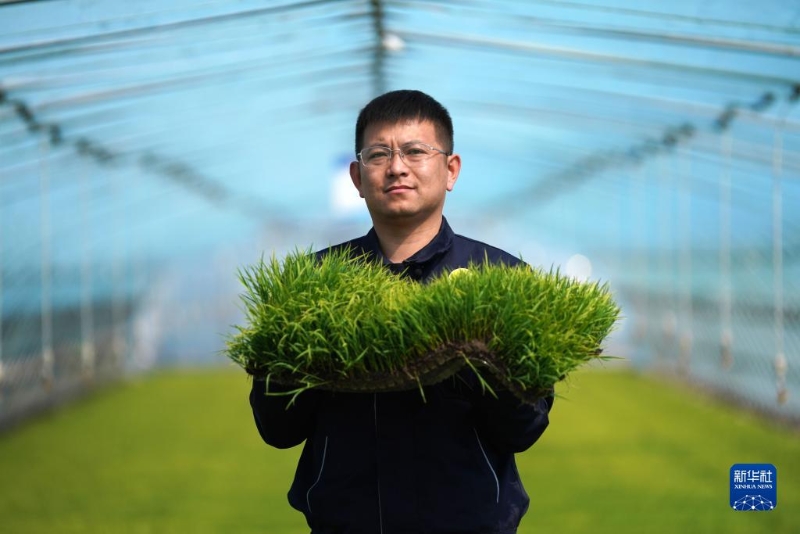 北大荒集團建三江分公司七星農(nóng)場有限公司種植戶陸向導手捧水稻秧苗(2022年5月18日攝)。 新華社記者 王建威 攝