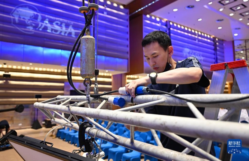 3月24日,工作人員在博鰲亞洲論壇國際會(huì)議中心檢查主會(huì)場設(shè)備。