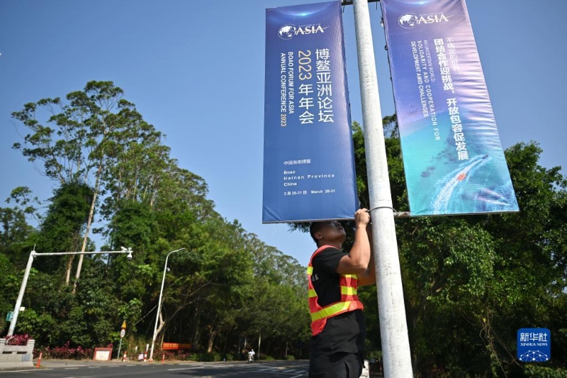 3月23日,工作人員在博鰲鎮(zhèn)懸掛博鰲亞洲論壇2023年年會(huì)主題宣傳牌。