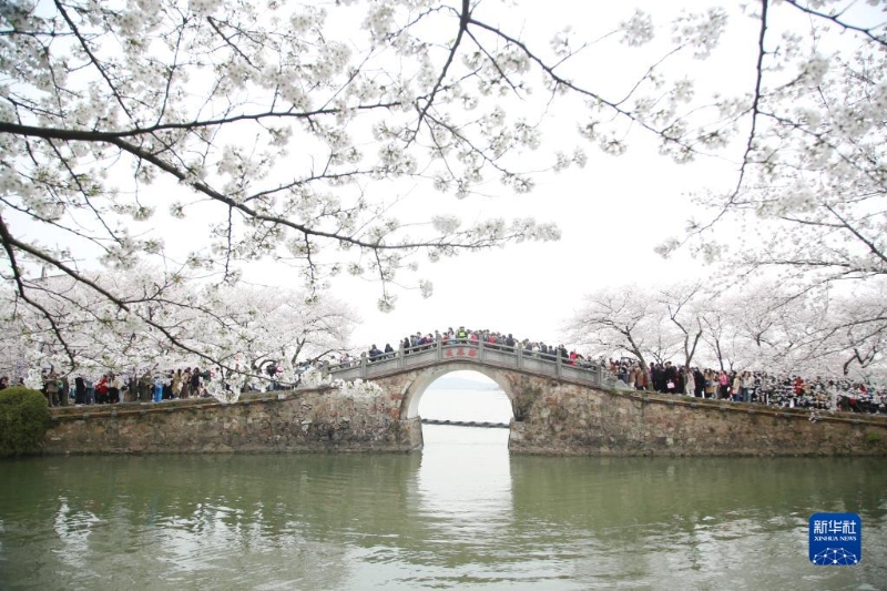 3月25日,游客在江蘇無錫黿頭渚景區(qū)觀賞櫻花。