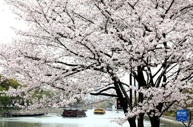 3月25日,在江蘇蘇州環(huán)古城河,游船與岸邊盛開的櫻花相映成景。