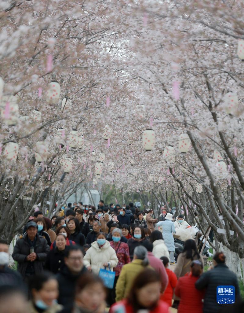 3月25日,游客在江蘇省揚(yáng)州市邗江區(qū)甘泉街道的櫻花園賞花游玩。