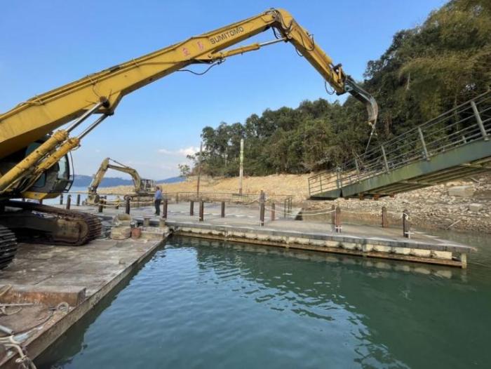 日月潭水位續(xù)降,為避免碼頭設(shè)施受損及考慮游客安全,日月潭風(fēng)景區(qū)管理處24日起再封閉玄光碼頭右側(cè)引橋。圖片來源:日月潭風(fēng)景區(qū)管理處提供