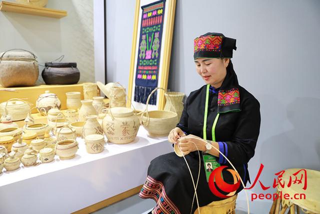 《“風(fēng)從海上來”——三亞創(chuàng)新發(fā)展主題展》現(xiàn)場(chǎng)展示黎族藤編技藝。 人民網(wǎng) 孟凡盛攝
