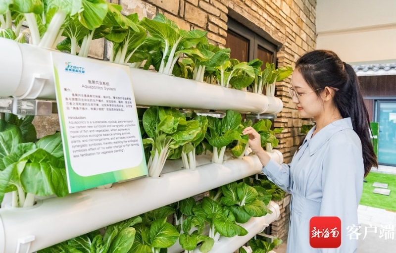 你見(jiàn)過(guò)無(wú)土栽培嗎?在科技創(chuàng)新展區(qū),一個(gè)零排放、低碳新型的“魚(yú)菜共生系統(tǒng)”吸引了眾多參觀者的眼睛。魚(yú)菜共生上面是一些膠管,膠管上種著菜,管里流著水,而在最下方池子里還養(yǎng)著魚(yú)。魚(yú)菜共生是可持續(xù)、循環(huán)性、零排放的低碳新型魚(yú)與蔬菜共生共長(zhǎng)的生產(chǎn)模式,實(shí)現(xiàn)動(dòng)物、植物、微生物三者之間的和諧的生態(tài)平衡。