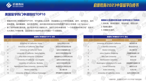 2023年3月18日,啟德教育在北京發(fā)布《2023中國留學白皮書》,《白皮書》援引啟德留學2023年調研數據顯示,影響學生留學院校選擇的前三因素分別是“綜合排名”、“專業(yè)排名”、“申請要求”。啟德留學2020-2022年客戶服務數據顯示,美國本科熱門申請院校前十中,90%是公立大學的翹楚,且加州大學系統(tǒng)的學校較多,除了加州地理位置優(yōu)越、各分校學術實力強勁以外,加州大學的申請采用“一個系統(tǒng)通申所有分校”的形式,顯著簡化了申請步驟。美國碩士熱門申請十大院校中,南加州大學位居首位,其次為哥倫比亞大學與波士頓大學,這些高校有一些吸引中國學生的共同特點:排名高、教育質量好、專業(yè)豐富、項目眾多,地理位置好,對國際學生友好。