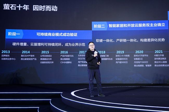 螢石國內(nèi)營銷中心總經(jīng)理郭航標(biāo)上臺(tái)發(fā)表主題演講,他表示,自2013年螢石品牌發(fā)布至今,已經(jīng)走過了第一個(gè)10年,經(jīng)過十年的技術(shù)沉淀和市場(chǎng)發(fā)展,螢石構(gòu)建了“智能家居+物聯(lián)網(wǎng)云平臺(tái)”的雙主業(yè),成長(zhǎng)為了一家軟件硬件一體化和產(chǎn)研銷一體化的AIoT公司。