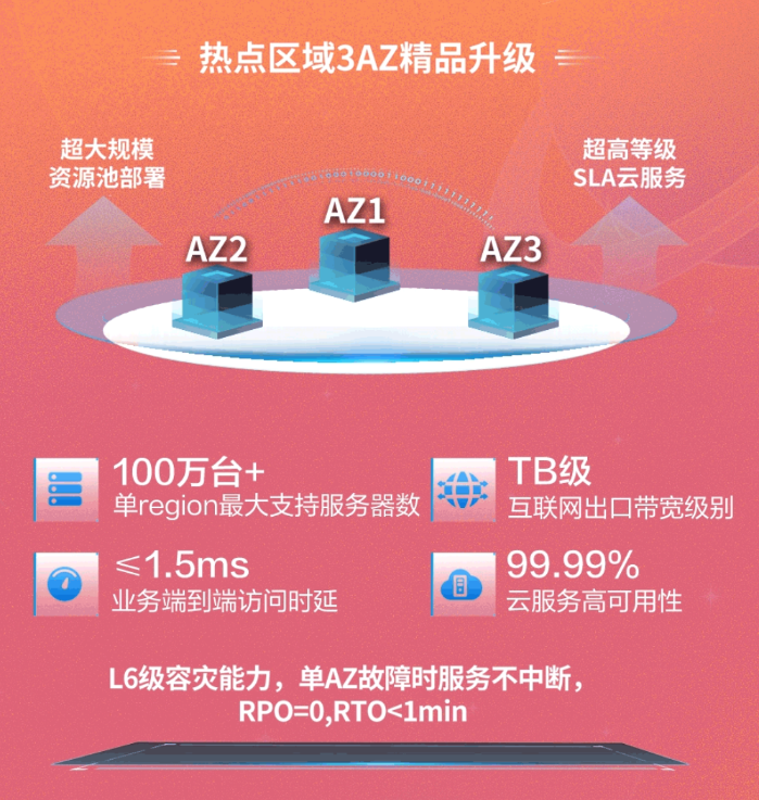 3AZ(Availability Zone可用區(qū))的Region架構(gòu),是當(dāng)前公有云TOP玩家的領(lǐng)先資源池架構(gòu)。通過將云服務(wù)對等分布在3個風(fēng)火水電隔離的高等級數(shù)據(jù)中心,支持提供無損性能的應(yīng)用體驗,并且支持高可用雙活容災(zāi),是真正高可靠、高可用、滿足客戶低時延算力需求的領(lǐng)先資源池。